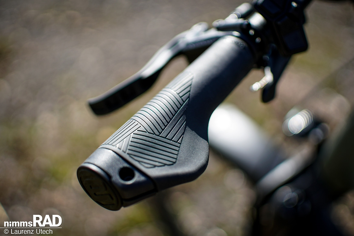 Ergotec-Komponenten bilden das Cockpit – mit ergonomischem XXL-Lenker, flexiblen EG Active Flex-Griffen und verstellbarem Aluminiumvorbau inklusive Blendr-kompatibler Displayhalterung.
