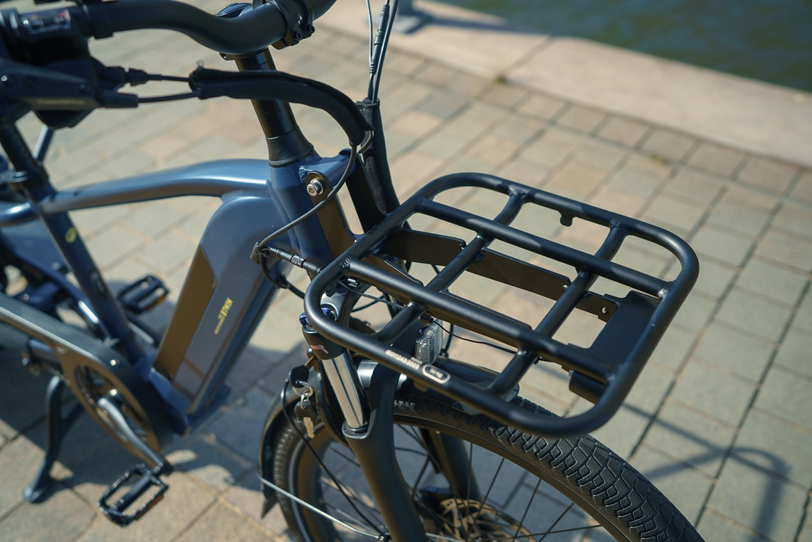Auch vorn kann optional eine Plattform mit bis zu 10 kg Nutzlast montiert werden. im Album B’TWIN E THREE 500