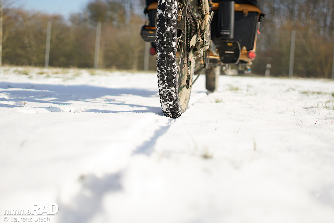 Selbst auf Schnee greift der Smart Sam Cargo zuverlässig – die ausgeprägten Stollen geben dem Rad Seitenhalt und Kontrolle.