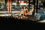 Zwei Radfahrerinnen mit Helmen sitzen am Ufer und blicken auf einen Fluss. Zwei Fahrräder liegen daneben. Im Hintergrund eine Brücke und Bäume.